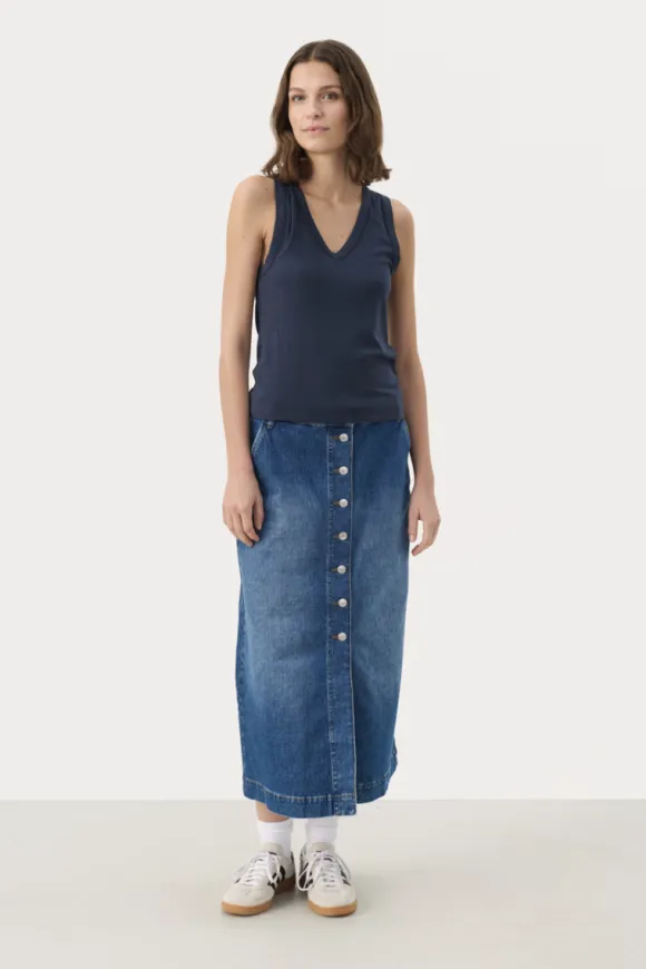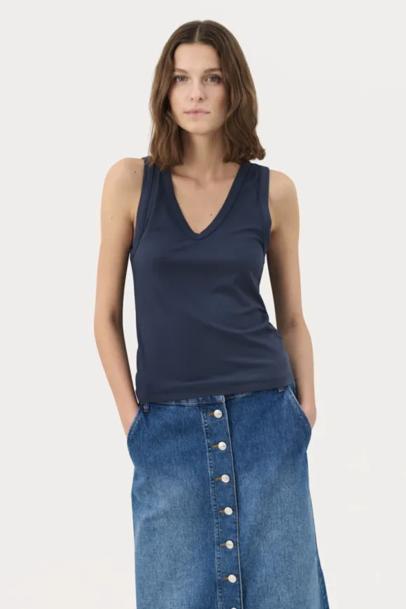Part Twon kevään uutta: klassinen toppi v-kaula-aukolla. Miellyttävää ribbineulosta. Käytä neuleiden tai bleisereiden alla tai kesällä sellaisenaan.
