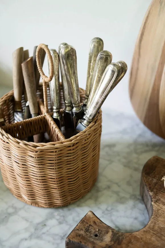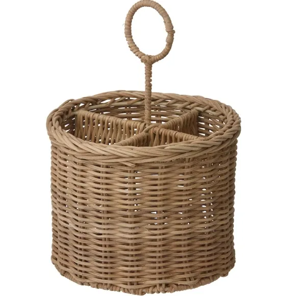 Meriruohosta valmistettu tukeva kori keittiön aterimille. Kaunis kori on kiva pitää esillä tiskipöydällä tai ruokapöydässä. Kahvan vuoksi helppo nostaa vaikka terassille kesäaikaan. Sopii myös veneilijälle. ja toimii myös kynäkorina…