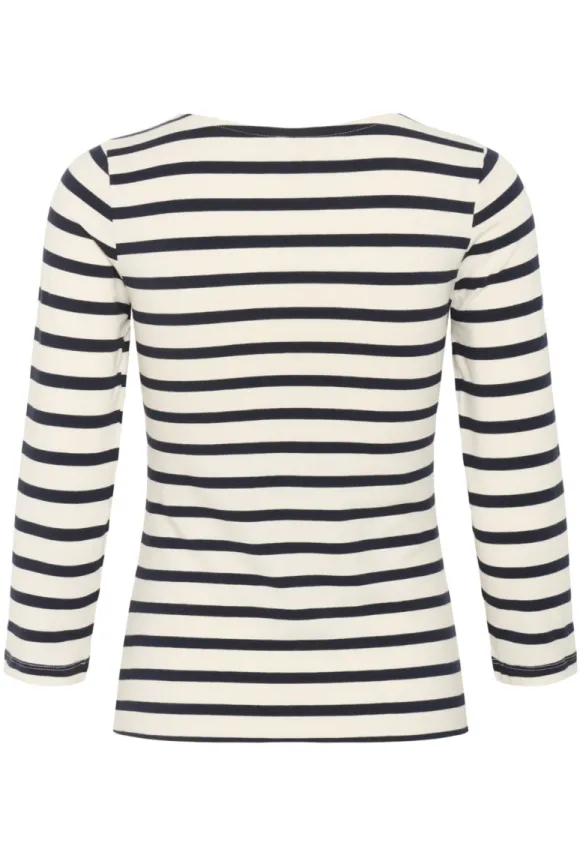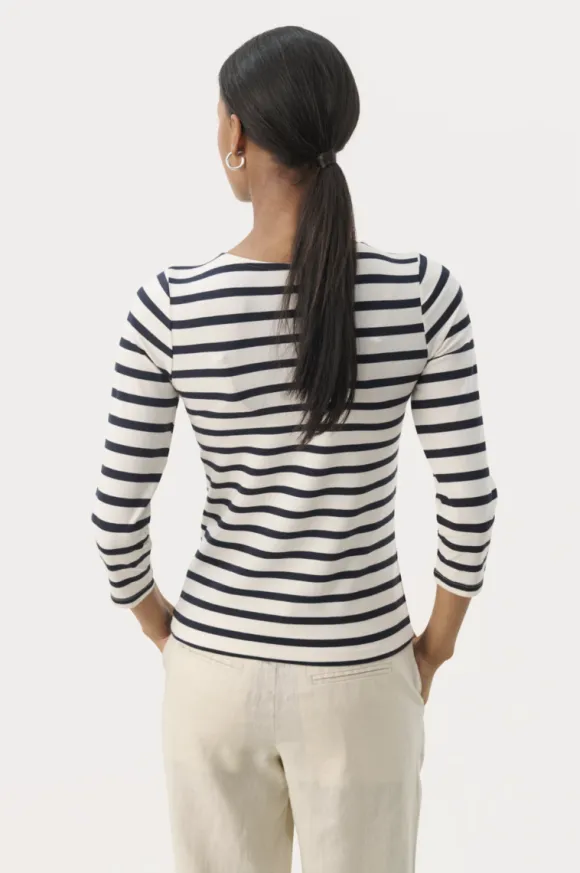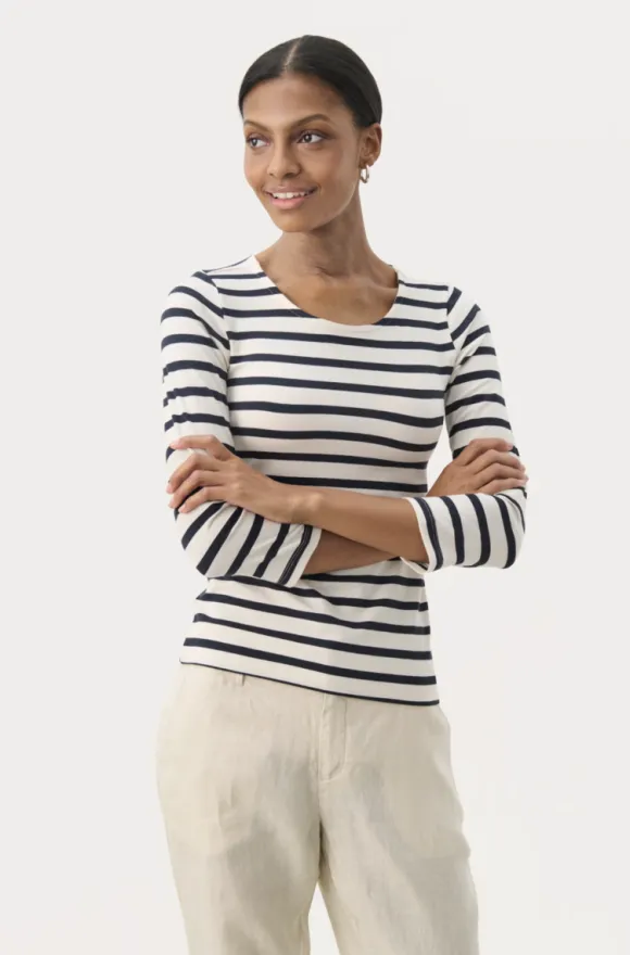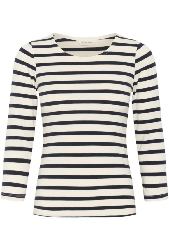 Part Twon raikas raidallinen trikoopaita 3/4-pituisilla hihoilla. Klassinen slim fit malli, joka on helppo pukea esim. neuleen alle. Kesällä ihana sellaisenaan shortsien tai pellavahousujen kanssa.