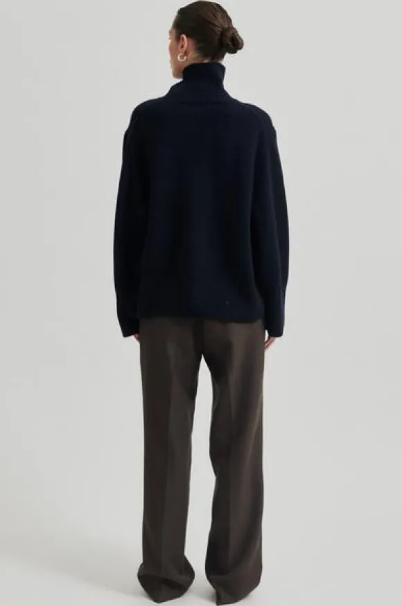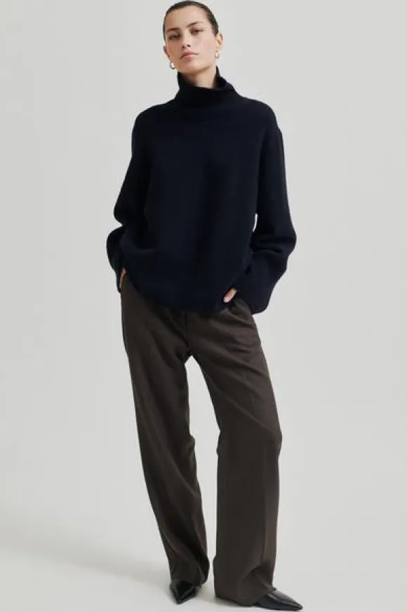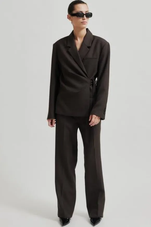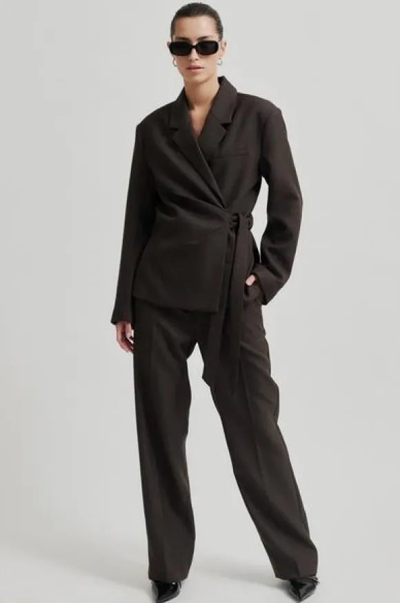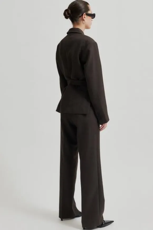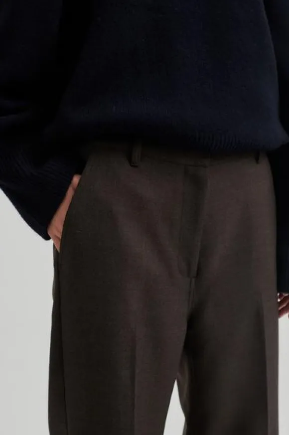 Second Femalen tyylikkäät villakangashousut suorilla lahkeilla ja keskikorkealla vyötäröllä. Vyolenkit, nappi- ja hakaskiinnitys. Mukavan pehmeää villasekoitetta.
