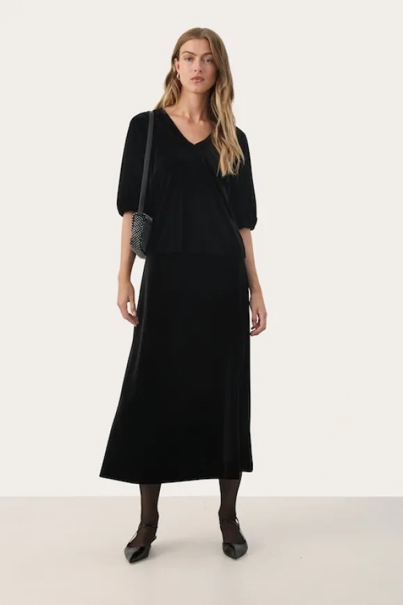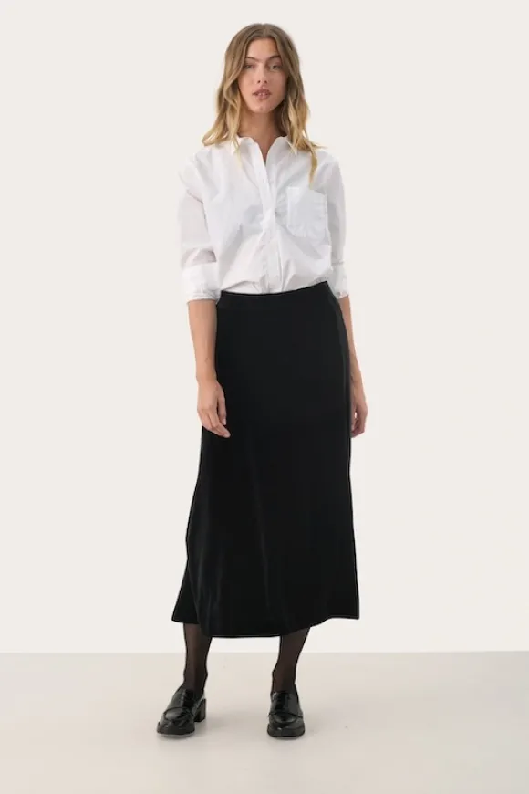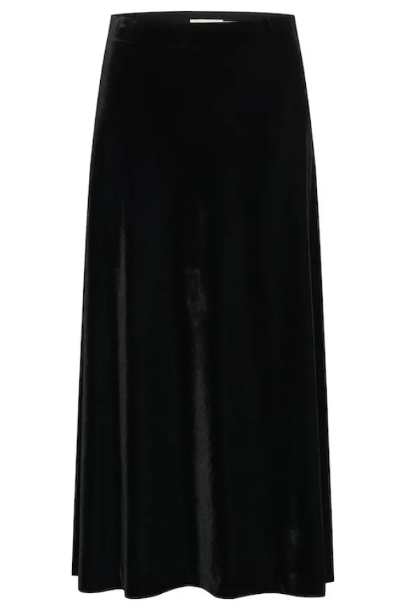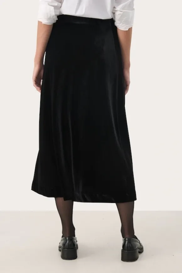 Part Twon kauniisti kiiltävä samettihame talven juhliin! Ihana naisellinen kevyesti levenevä malli, jossa kuminauhavyötärö. Kangas joustavaa veluuria.